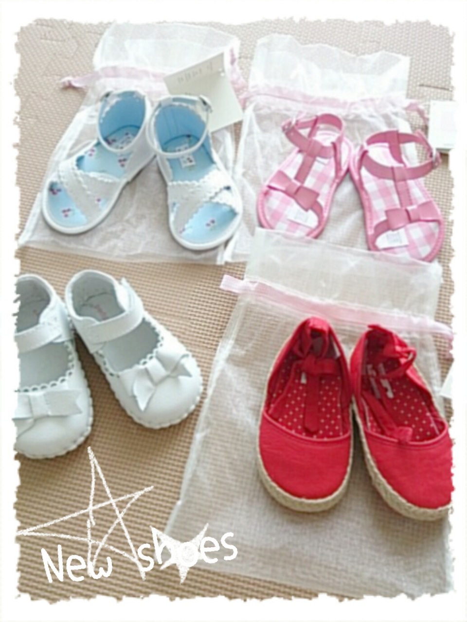 New shoes♪ ずっと履かせていたボンポワンのファーストシューズがすっかり小さくなったので新しいお靴を揃えました。早く歩く練習に行きたいな♪赤いのは昨年お祝いでいただいたもの。ちょうど今夏のサイズなので履かせなくちゃ!後ろの2つは旅行用にと揃えました。夏らしいデザインで可愛い☆海外のものはお安いし可愛くて好みです。品質はさておき(笑)さて、暑すぎて昨日今日と在宅にしてしまいました。明日明後日は頑張って出社しないと!ファイトー