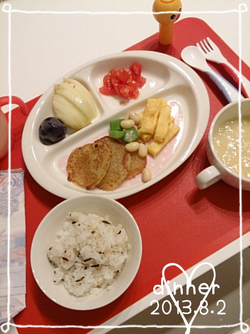 ことこと豆乳で作ったコーンスープ、ひじきごはん、卵焼き、おくら、
