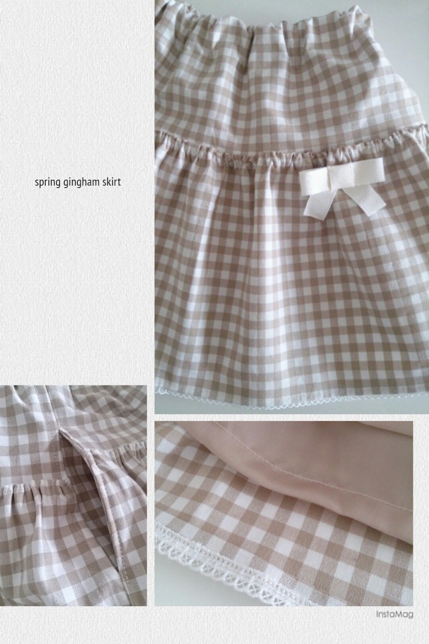 春ギンガム。 春に向けてベージュのギンガムでスカートを作りました。ギャザーたっぷり、ベージュの裏地もつけて。ポケットにもチャレンジしてみました。裾には小さめのレースをあしらい、春らしい仕上がりに。お気に入りのショップで生地をオーダーしたり、予約したりでストックしていて作りたいパターンもたくさんスクラップしてあるので日々、時間があれば妄想しています。さて、次は何を作ろうかしら?スカート クルール ストレッチギンガム シフォンベージュ裏地 ベンベルグリボン&レース mokuba
