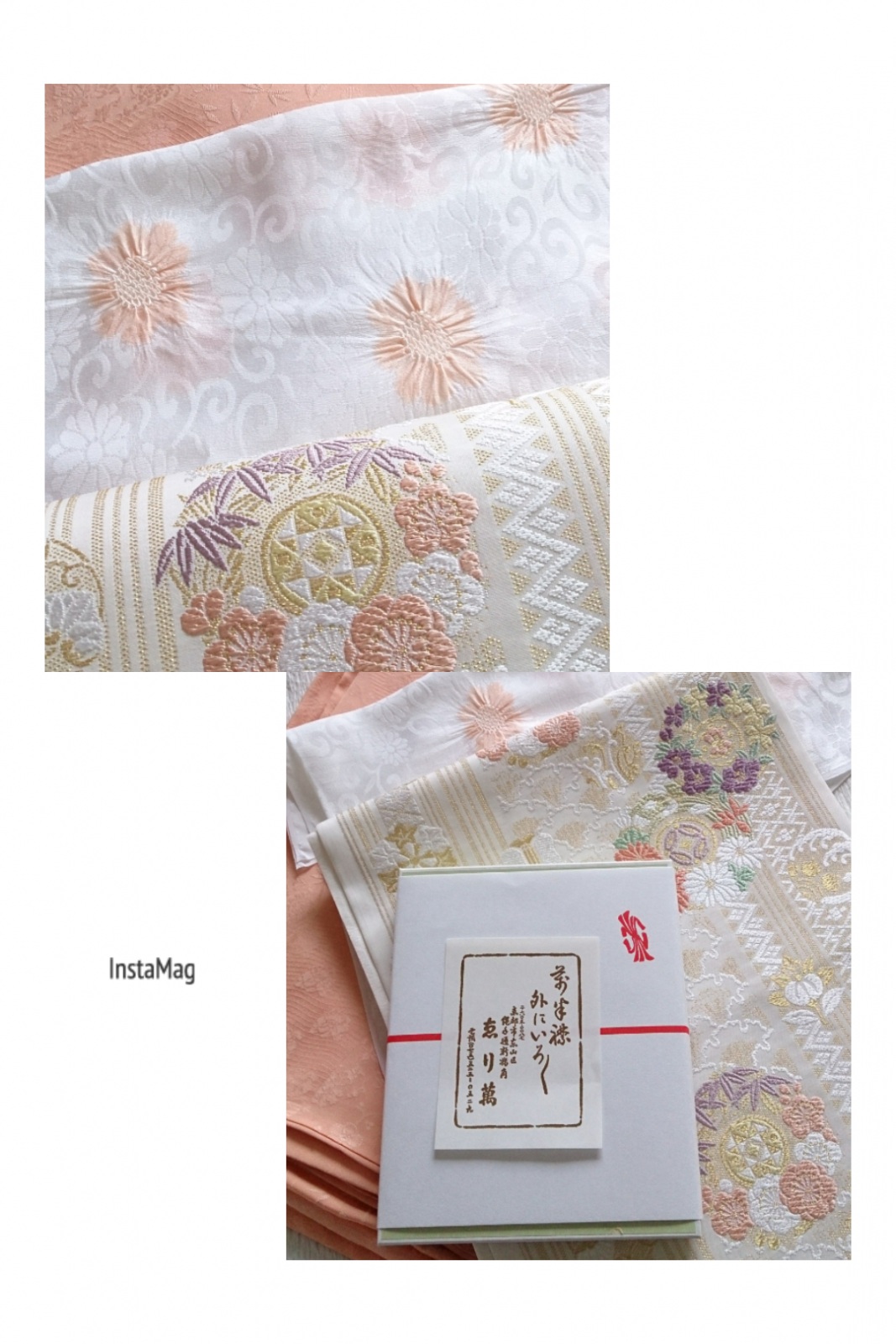 my first.. 初めての飛び絞り。先日、京都に立ち寄られたお友達にお願いして素敵な1枚を選んできていただけました。華やかな菊唐草の地紋に絞りが素敵。大好きなサーモンピンクにとても良く合う色合いです。近いうちに京都に行きたいな…♪